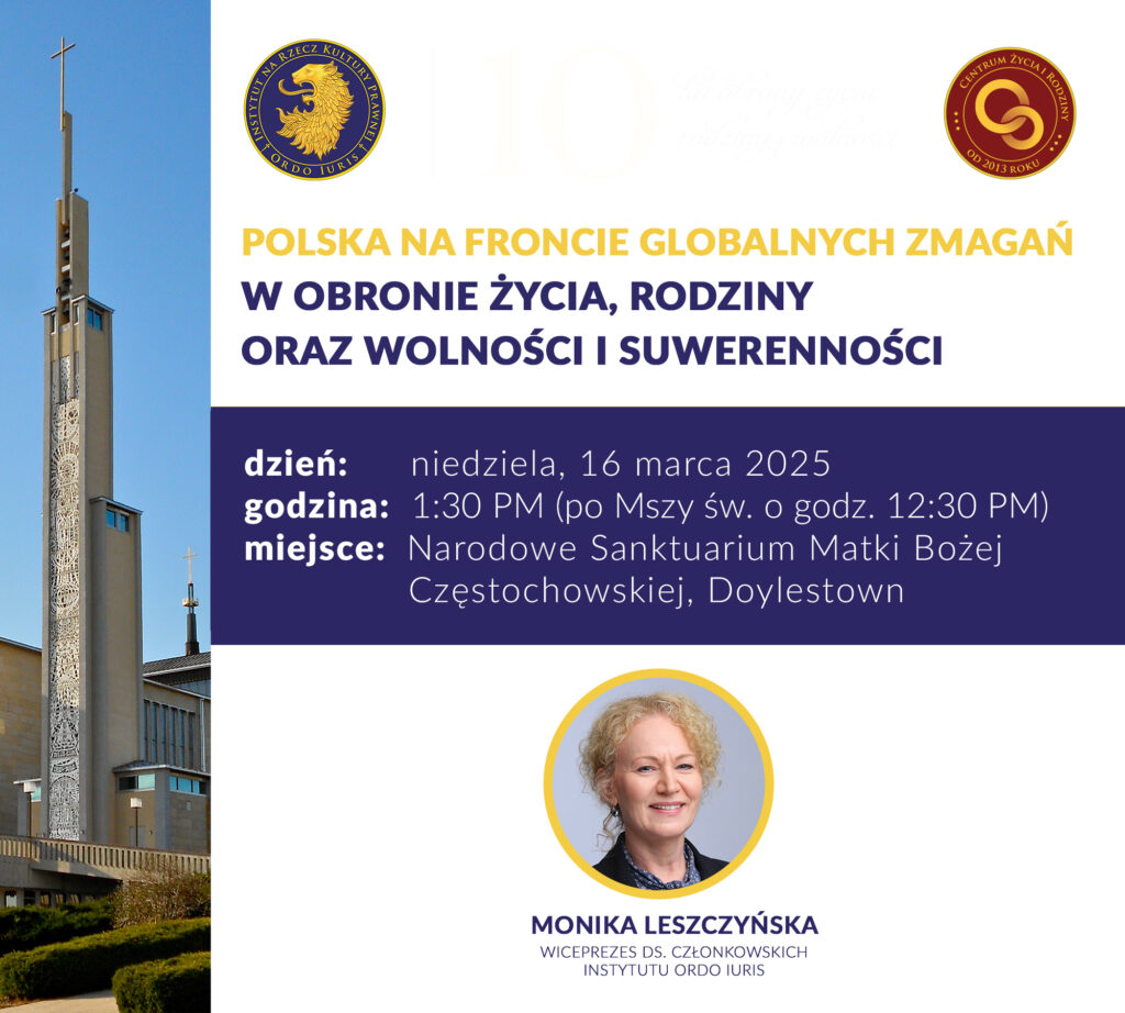 Na arenie międzynarodowej trwają ataki na życie, rodzinę i narodową suwerenność. Jak w tej sytuacji odnajduje się Polska? Temu zagadnieniu poświęcone będzie spotkanie z Moniką Leszczyńską wiceprezesem Ordo Iuris. Wydarzenie odbędzie się 16 marca w amerykańskim Doyelstown.